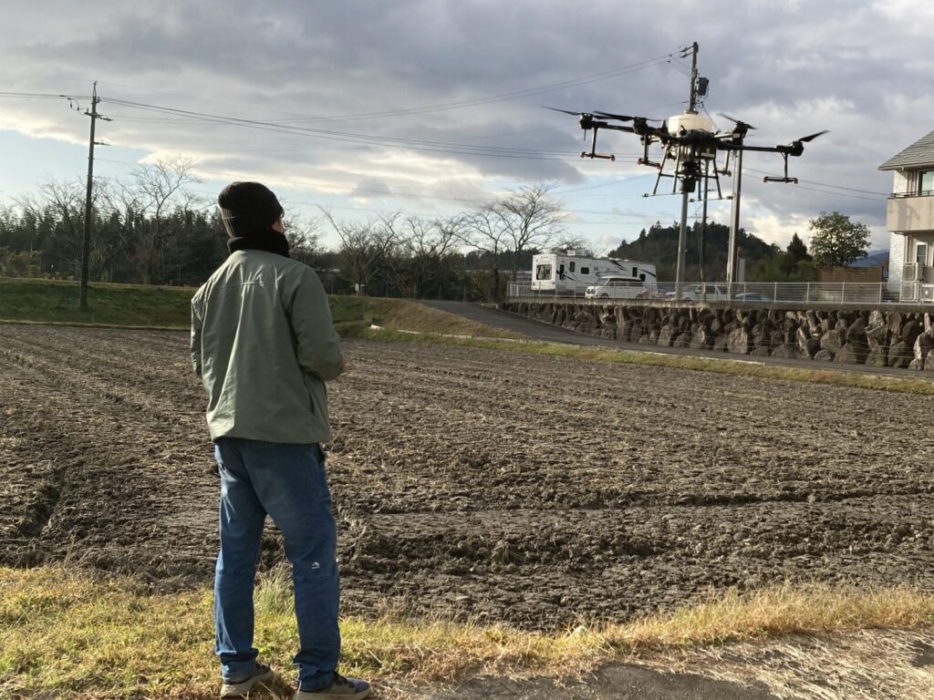 下の写真は伊藤さんがドローンで、れんげの種まきをしている様子です(2024年晩秋)。ドローンが大きいことに驚きました!